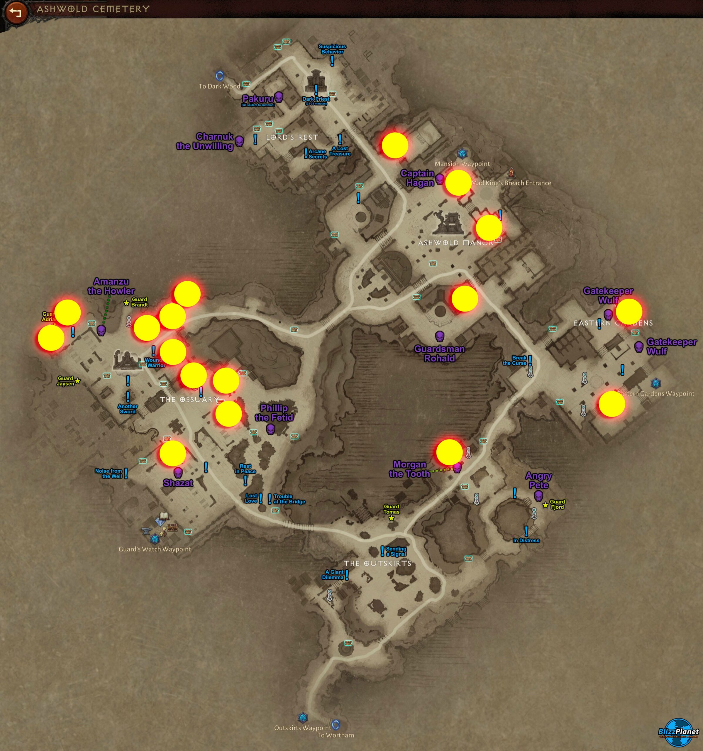 | Ashwold Cemetery | Near Bone Sculptor workshop, NE crypts, central mausoleum | Purple mist and glowing tombstones |