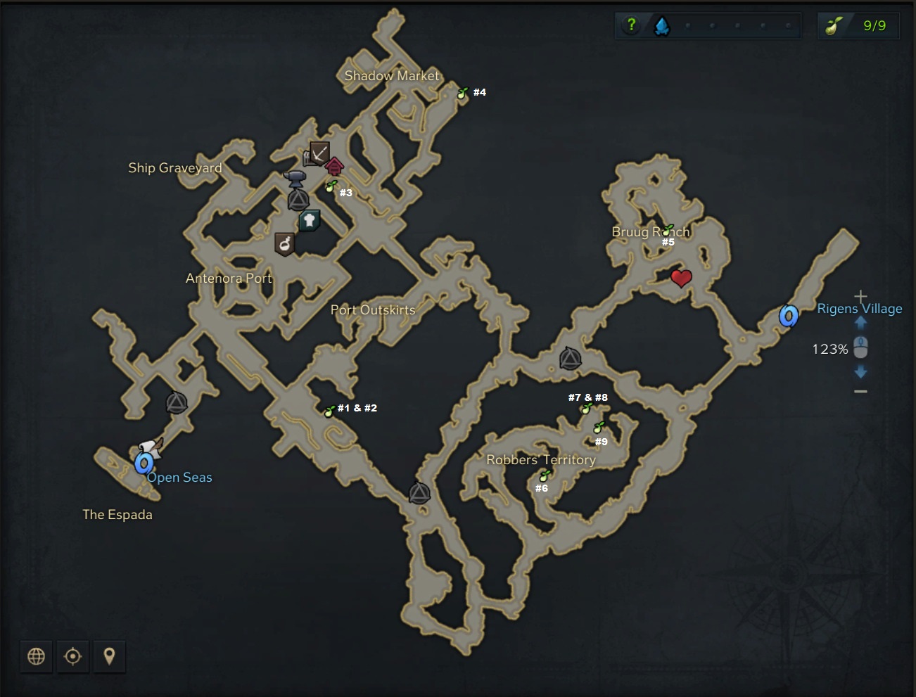 Start at the central settlement. Seeds 1–3 sit near the marketplace and a collapsed building—easy if you look behind things. Seeds 4–5 hide in the northern mine behind breakable ice. Seed 6 needs a rope climb. Seeds 7–8 are along a southern patrol path; one’s by a frozen waterfall. Seed 9 is under the eastern watchtower.